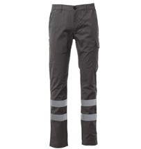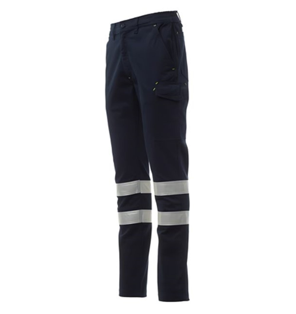 Calças twill stretch de algodão, com bandas refletoras de cat.1, com presilhas e elástico na cintura. Fecho de correr e botão. Dois bolsos clássicos na frente, pequeno bolso para moedas, bolso para fita métrica do lado direito, bolso do lado esquerdo com paleta de fecho LOCK SYSTEM. Dois bolsos atrás, dos quais um com paleta com abertura fácil. Costura tripla.