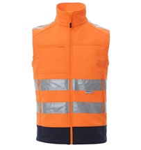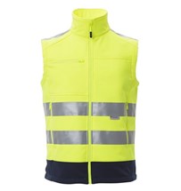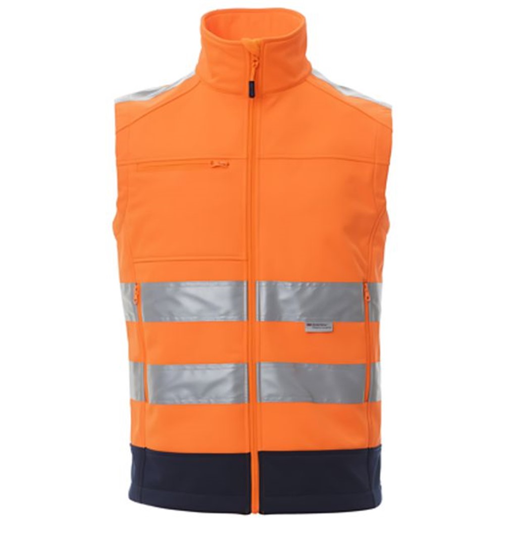 Colete de ajuste ergonómico, de alta visibilidade bicolor de homem com faixas 3M, fecho de correr SBS de tira comprido, dois bolsos laterais com fecho de correr, um bolso de peito e porta-identificação destacável e rebatível.