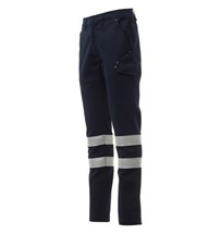 Calças twill stretch de algodão, com bandas refletoras de cat.1, com presilhas e elástico na cintura. Fecho de correr e botão. Dois bolsos clássicos na frente, pequeno bolso para moedas, bolso para fita métrica do lado direito, bolso do lado esquerdo com paleta de fecho LOCK SYSTEM. Dois bolsos atrás, dos quais um com paleta com abertura fácil. Costura tripla.